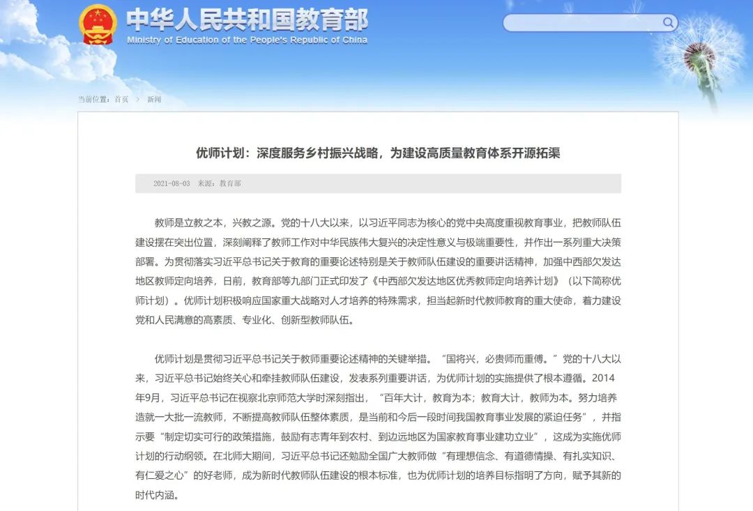 日前,教育部等九部门正式印发了《中西部欠发达地区优秀教师定向培养计划》(以下简称优师计划)。8月3日,教育部网站发布了我校党委书记程建平的解读文章《优师计划:深度服务乡村振兴战略,为建设高质量教育体系开源拓渠》。文章对文件内容进行了深入解读,阐释了优师计划在落实高质量教育体系建设、探索中西部欠发达地区基础教育高素质师资定向培养、助力国家乡村振兴战略等方面的重要作用。