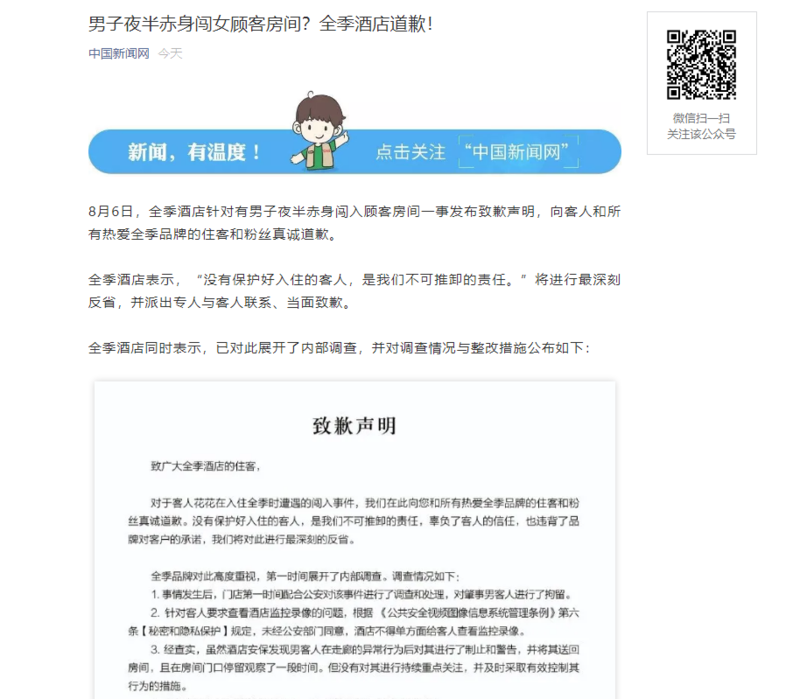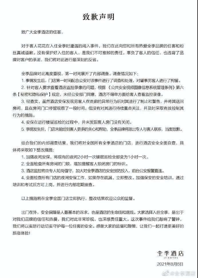 8月6日,全季酒店针对有男子夜半赤身闯入顾客房间一事发布致歉声明,向客人和所有热爱全季品牌的住客和粉丝真诚道歉。