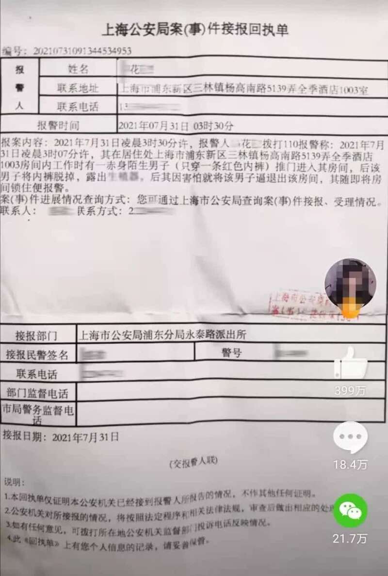 8月5日晚,有网友在微博发布视频称,入住上海某全季酒店时,凌晨3时许遭一个陌生男子全裸闯入房间。在此之前,该男子已经全裸从酒店7楼至10楼挨个尝试推开酒店房门,其间并无工作人员发现制止。