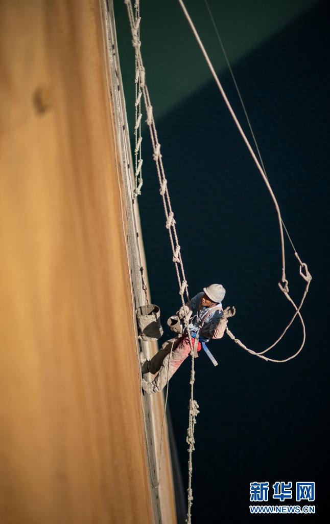 工人对白鹤滩水电站大坝进行养护(5月13日摄)。