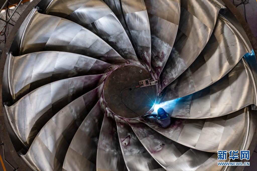 工人对白鹤滩水电站发电机组所需的转轮进行局部消缺处理(无人机照片,5月14日摄)。