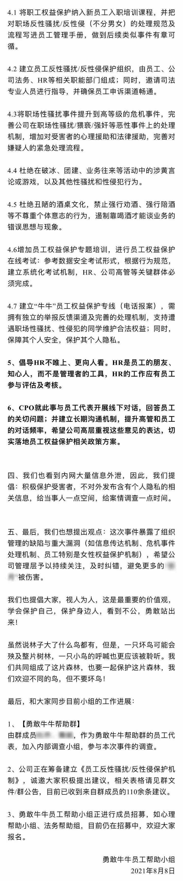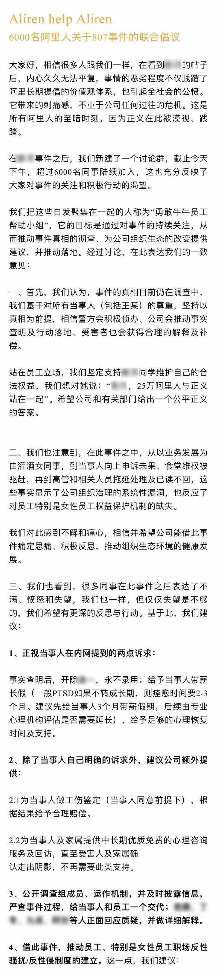 8日,“勇敢牛牛员工帮助小组”在Aliren help Aliren发布《6000名阿里人关于807事件的联合倡议》,倡议认为,事实显示了公司组织治理的系统性漏洞,也反映了对员工特别是女性员工权益保护机制的缺失。希望公司借此事件,推动员工特别是女性员工职场反性骚扰、反性侵制度的建立。