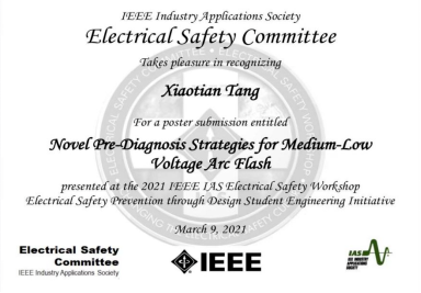 前不久,2021年IEEE工业应用学会(IEEE Industry Application Society)旗舰会议Electrical Safety Workshop(IEEE ESW)举行,电子科技大学机械与电气工程学院2020级博士生唐啸天在导师张真源副研究员指导下,凭借在电力系统电弧事故分析预防方面的创新性研究成果“Novel Pre-Diagnosis Strategies for Medium-Low Voltage Arc Flash”荣获"IEEE IAS Electrical Safety Prevention Through Design Student Engineering Initiative"(电气安全设计奖)。该奖项为IEEE工业应用学会的最高等级学生奖励,电子科技大学为该奖项的唯一单位,唐啸天为第一获奖人并获IAS学生科研资助奖励。
