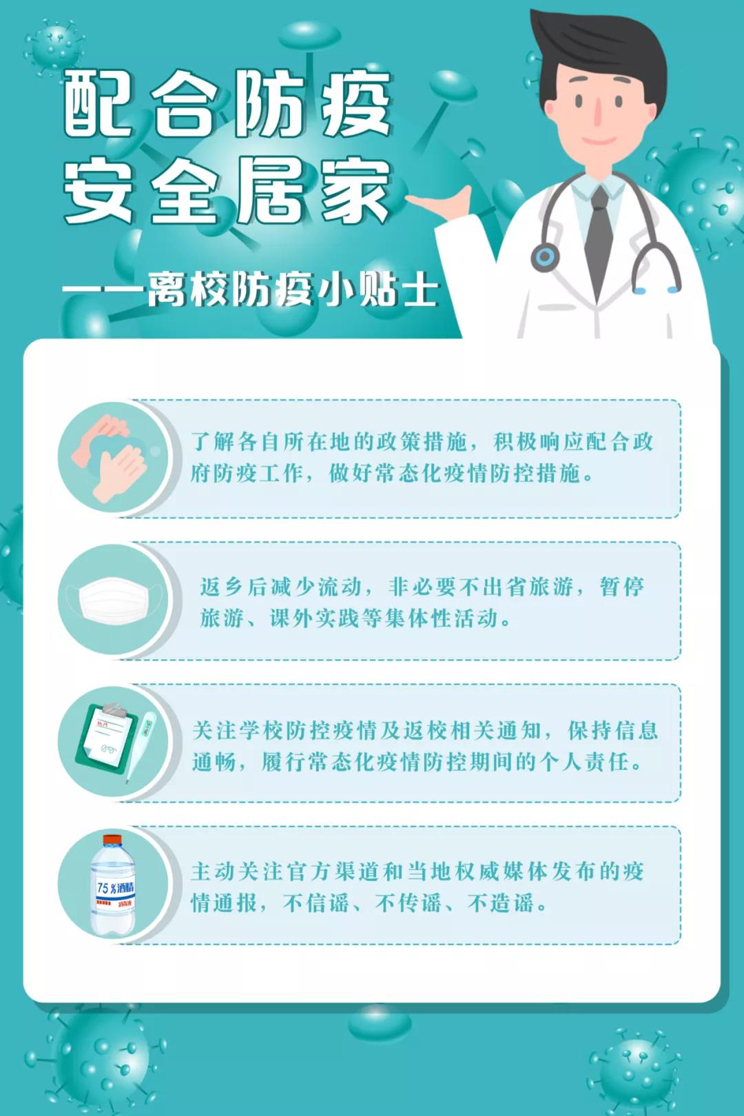 认清当前疫情防控的严峻形势,全面提升加强疫情防控的思想自觉和行动自觉。离校同学应了解各自所在地的政策措施,积极响应配合政府防疫工作,同时关注学校通知,保持消息实时更新、情况及时汇报;留校同学请按学校和学院的要求做好防护,配合各项防疫工作。