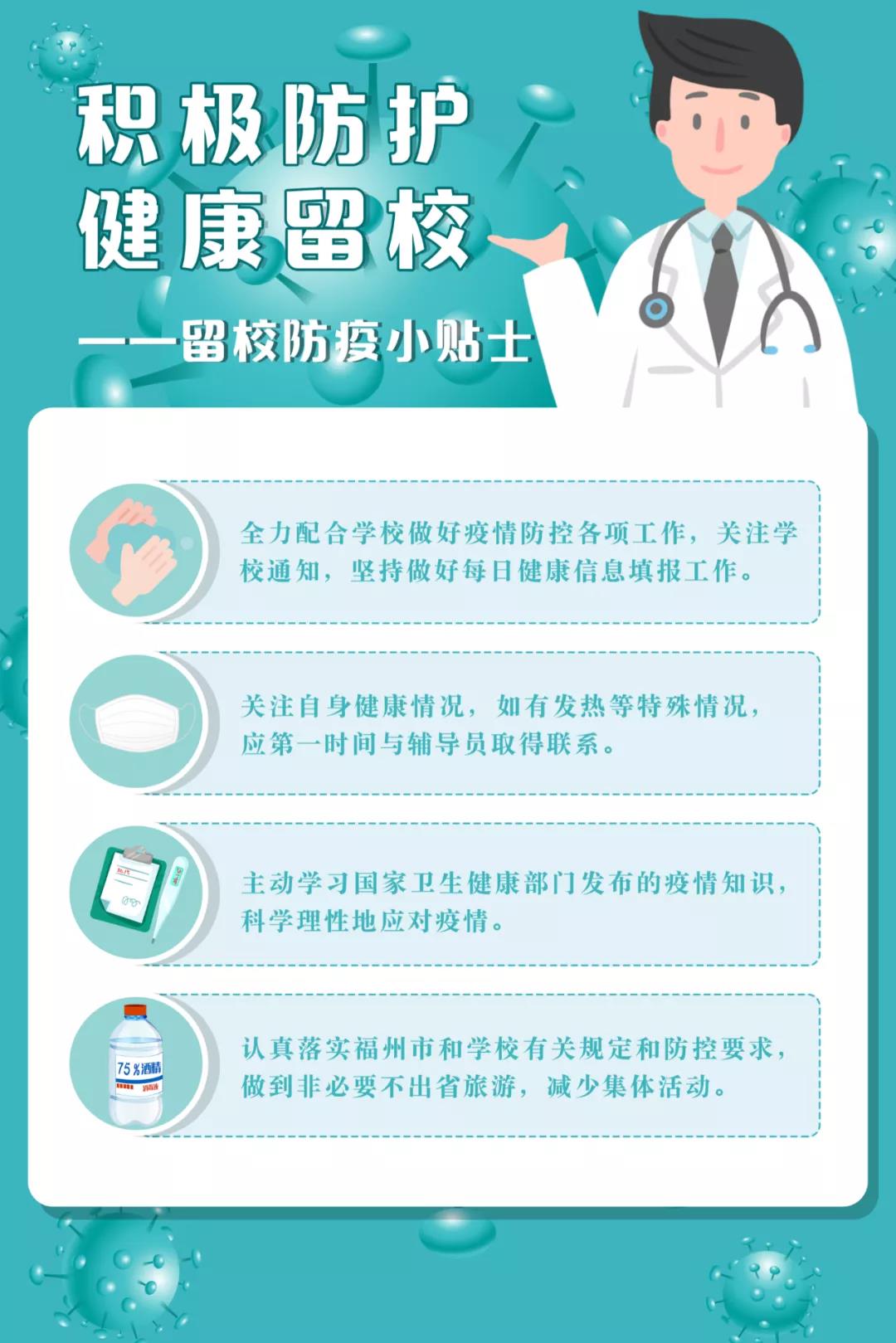 当前,新冠肺炎疫情防控形势仍然严峻,全国多地出现疫情反复。正值暑期出行高峰,在这个特殊的时间点,我们更应做到防疫为先,生命为重。为精准做好“外防输入,内防反弹”,降低疫情传播风险,切实保障同学们的身体健康和生命安全,福建师范大学学生会、研究生会特向全体同学发起倡议: