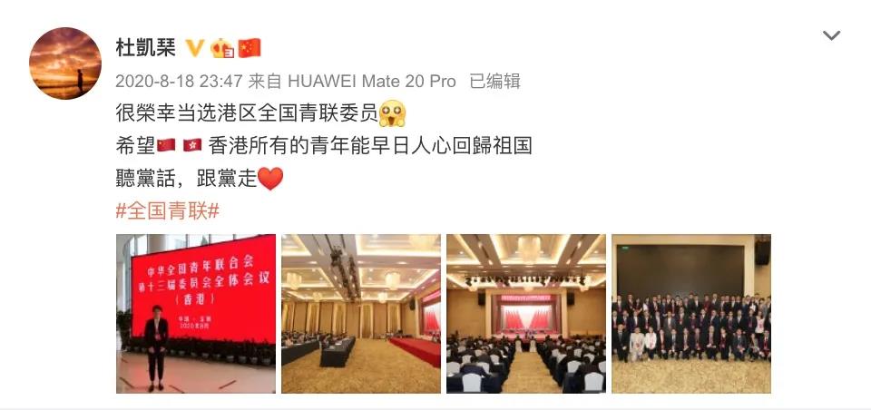 在这条宣布自己当选港区全国青联委员的微博中,杜凯琹说,“希望中国香港所有的青年能早日人心回归祖国。听党话,跟党走。”