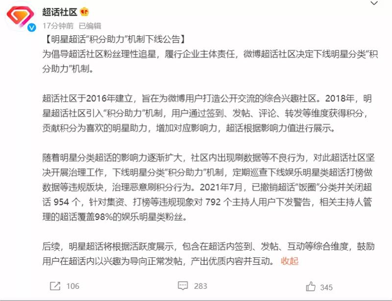 8月10日上午10点,超话社区官方微博发布公告称,为倡导超话社区粉丝理性追星,履行企业主体责任,微博超话社区决定下线明星分类“积分助力”机制。