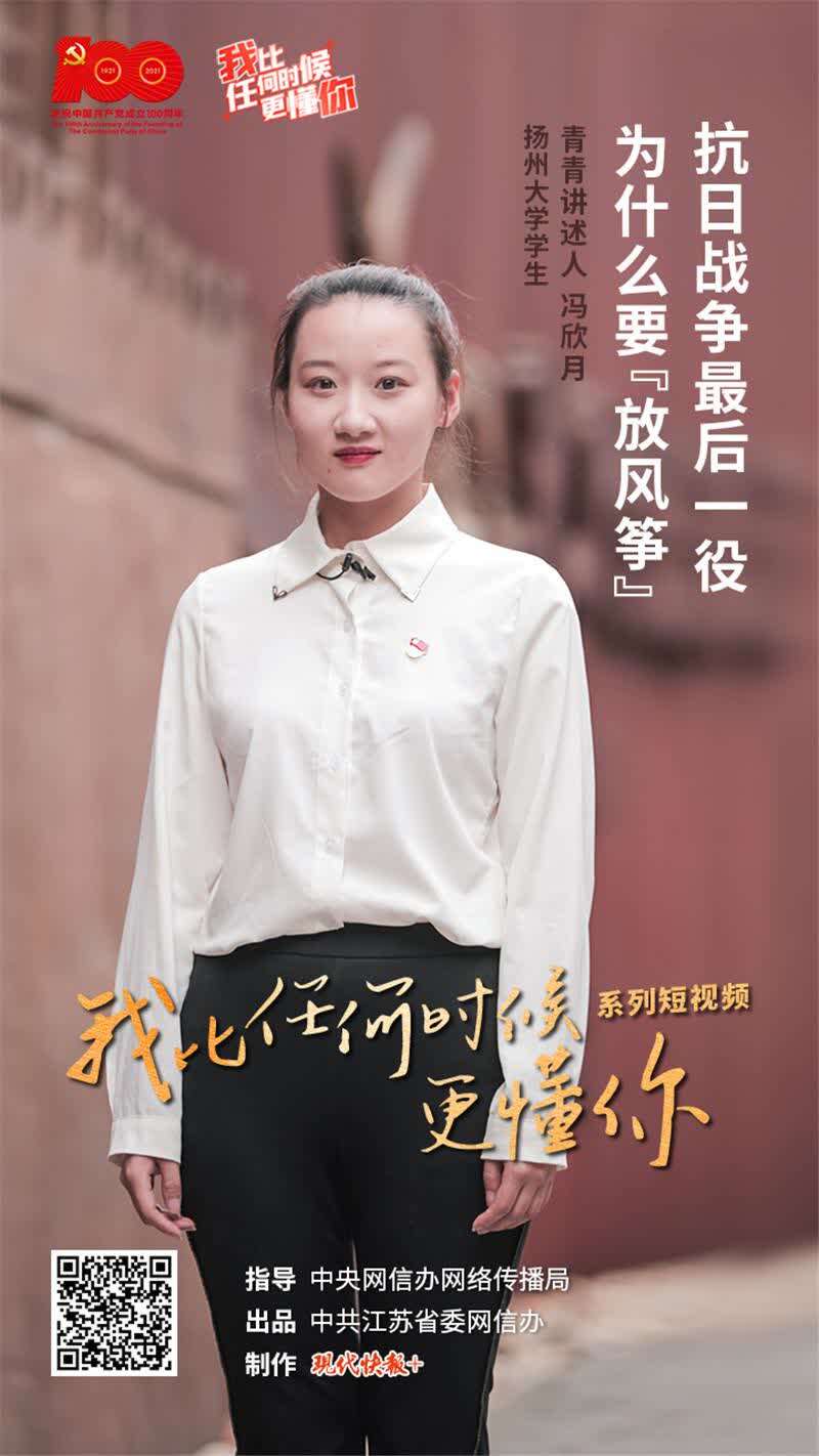 8 月 13 日," 我比任何时候更懂你 " 系列短视频第 20 集《抗日战争最后一役为什么要 " 放风筝 "?》上线,本集青青讲述人是扬州大学学生冯欣月。