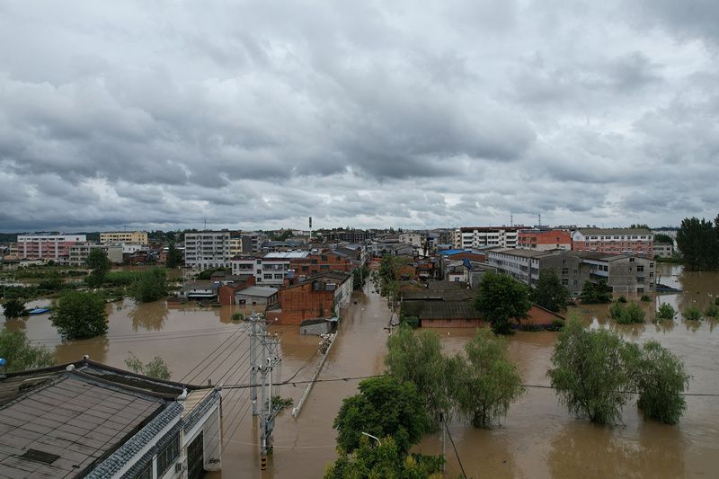2021年8月12日,湖北随州,航拍柳林镇受灾现场。