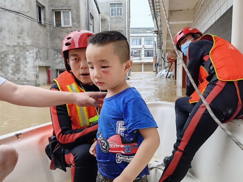 2021年8月12日,湖北随州何店镇,消防救援人员正在转移被困群众。