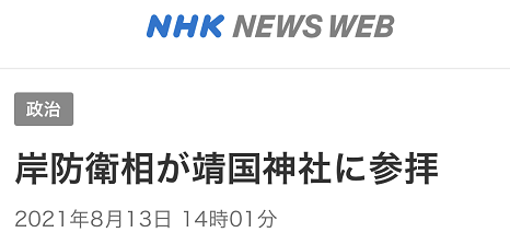 13日下午2时前,岸防卫大臣前往东京九段参拜靖国神社,图源NHK