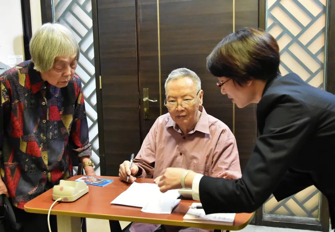 卢永根院士及夫人徐雪宾教授在银行职员的指引下确认捐赠手续