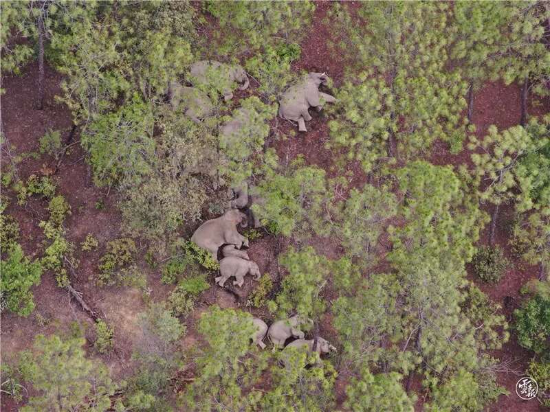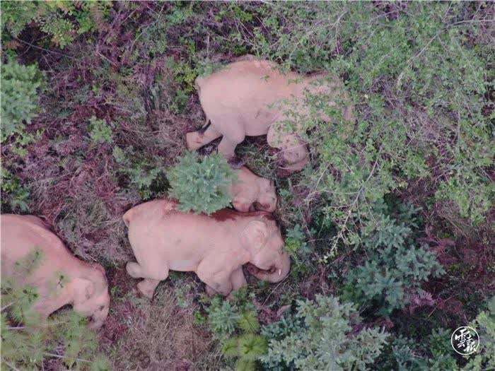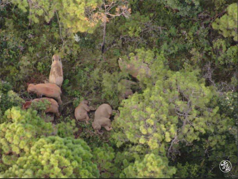 8月7日,北移亚洲象群仍在玉溪市元江县甘庄街道附近林地内活动。