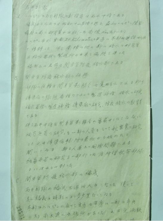 在这份笔供的开篇,北野政次就写道:石井四郎中将是731部队的创始人。部队的任务是依照关东军勤务令的规定,进行传染病的预防、各种疫苗的制造补给、给水研究、给水器材制造补给,传染病的研究、防疫给水教育等;然而除此之外,石井四郎还命令731部队进行了其他方面的研究。