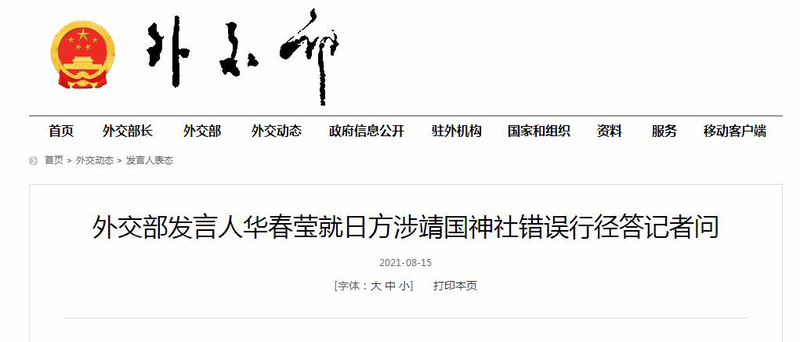 问:据媒体报道,8月15日,日本首相菅义伟向靖国神社供奉了香火钱。前首相安倍晋三、几个内阁成员和一些国会议员当天或几天前分别参拜了靖国神社。中方对此有何评论?
