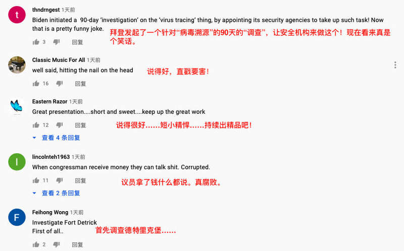 在西方媒体占主导的海外社交媒体平台,能够取得关注和支持并不容易。但是这一揭露美政客对于新冠溯源阴谋的系列视频摆事实、讲证据、有逻辑、有新意,让谣言不攻自破,自然能获得更多人的赞同。就跟网友点评的一样:“直戳要害!”