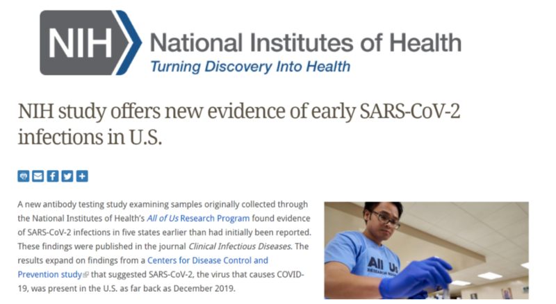 2020年1月21日,美国官方报告首例新冠肺炎确诊病例。然而越来越多证据显示,美国早期病例出现的时间正在不断被刷新。美国国立卫生研究院研究发现,美国5个州的新冠病毒感染证据在2019年12月就已出现。