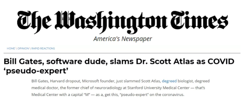 这一言论在当时引发了美国舆论对放任病毒传播将造成更大规模传染的担忧。除此之外,阿特拉斯还曾为了配合白宫的政治需求给出了一系列反科学的抗疫建议,不断传播错误信息,例如佩戴口罩和保持安全距离不能有效地减缓新冠病毒的传播、儿童不会受到新冠疫情的影响等。他甚至还鼓动民众反抗地方政府为遏制疫情而采取的限制措施。比尔·盖茨此前在接受采访时曾怒斥:阿特拉斯就是一位给总统当顾问的伪专家!