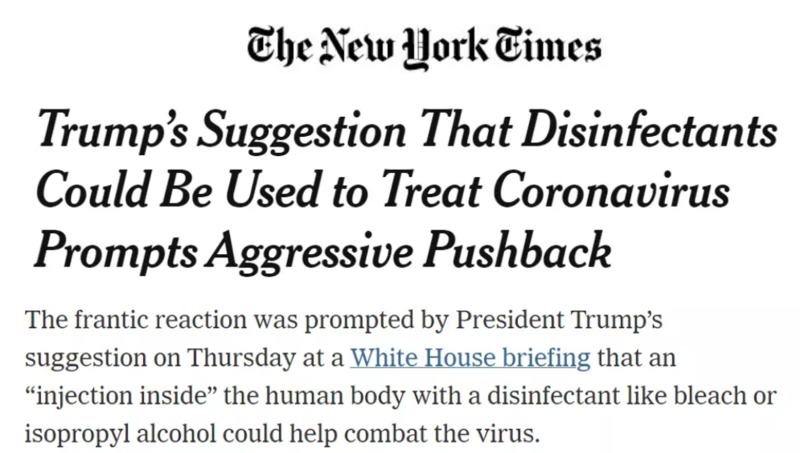 美国媒体曝光的一段政府内部会议录音显示,美国官员很早就指出新冠病毒的传播力上是最强的,但美国联邦政府几乎未采取任何具体防范措施,时任美国领导人甚至还通过多种渠道公布严重违反科学常识的信息。他在去年4月公开表示,通过向体内注射消毒剂可以防范新冠病毒,引起美国国内和国际社会舆论一片哗然。