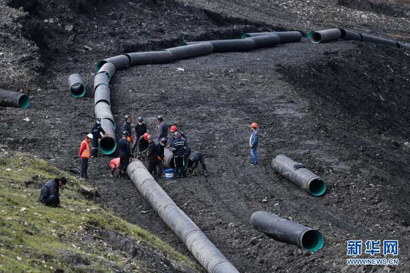 8月16日,救援人员在青海柴达尔煤矿冒顶事故救援现场铺设排水管道。新华社记者 吴刚 摄