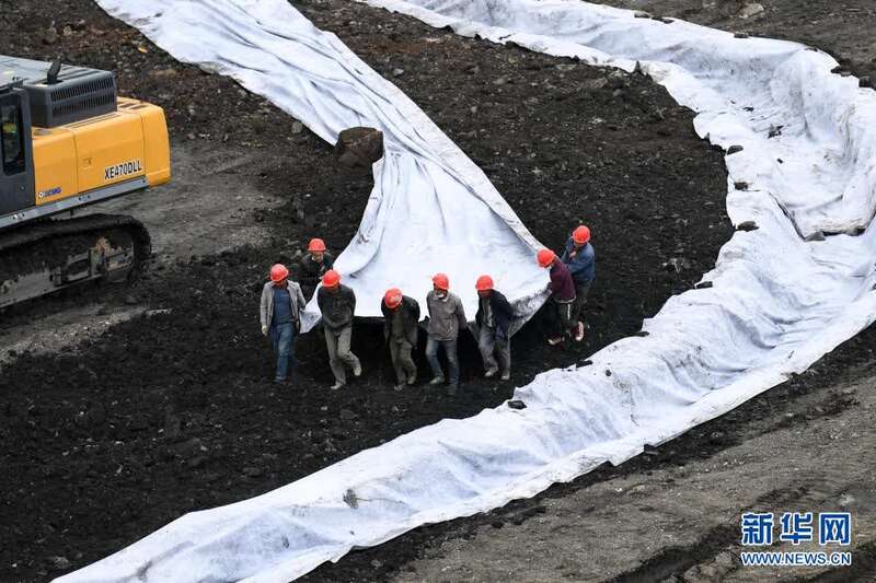 8月16日,救援人员在青海柴达尔煤矿冒顶事故救援现场铺设防渗膜。新华社记者 吴刚 摄