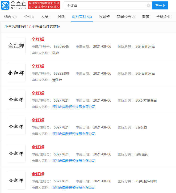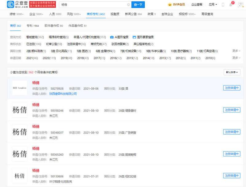 企查查App数据显示,全红婵商标被多方申请注册,最早申请日期为8月5日,商标国际分类涉日化用品;“杨倩”商标亦被多方抢注,国际分类涉及酒、钮扣拉链等,申请人为陕西唐森科技有限公司、叶尔帕提·吐地别克,商标状态均为注册申请中。此前,包含马龙在内的多个东京奥运会冠军姓名被抢注商标。