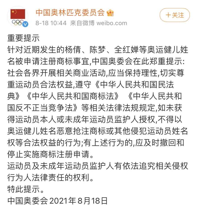 中国青年报客户端北京8月18日电(中青报·中青网记者 孟佩佩)针对近期发生的奥运会冠军杨倩、陈梦、全红婵等姓名被申请注册商标事宜,中国奥林匹克委员会官方微博今日发布重要提示,社会各界开展相关商业活动,应当保持理性,切实尊重运动员合法权益,如未获得运动员本人或未成年运动员监护人授权,不得以奥运健儿姓名恶意抢注商标或其他侵犯运动员姓名权等合法权益的行为;有上述行为的,应及时撤回和停止实施商标注册申请。运动员及未成年运动员监护人有依法追究相关侵权行为人法律责任的权利。