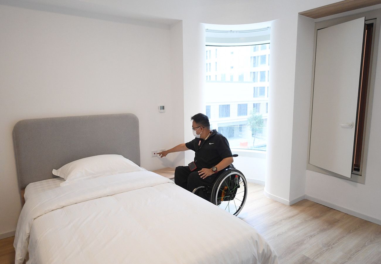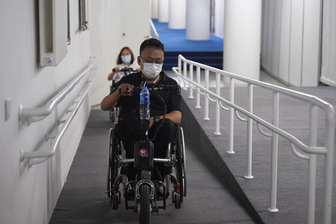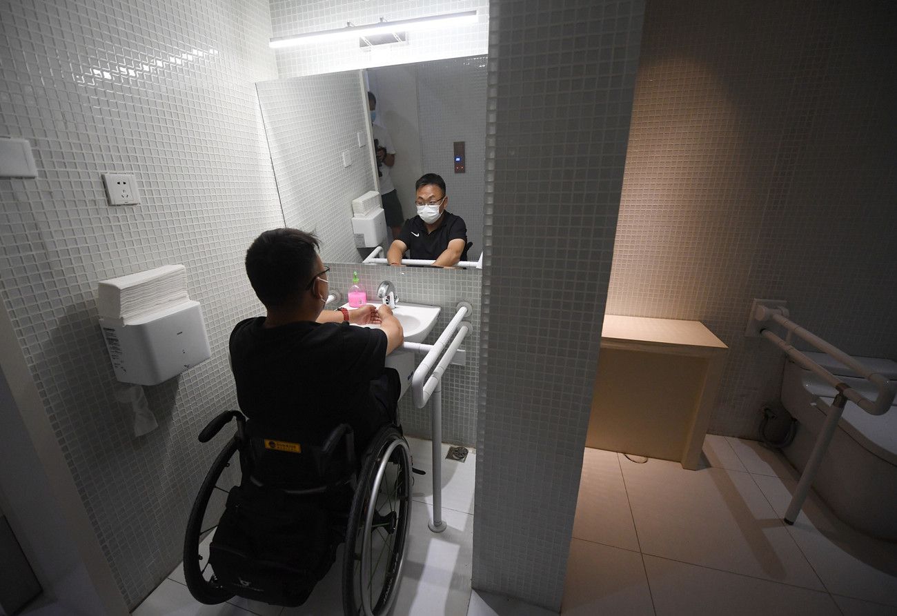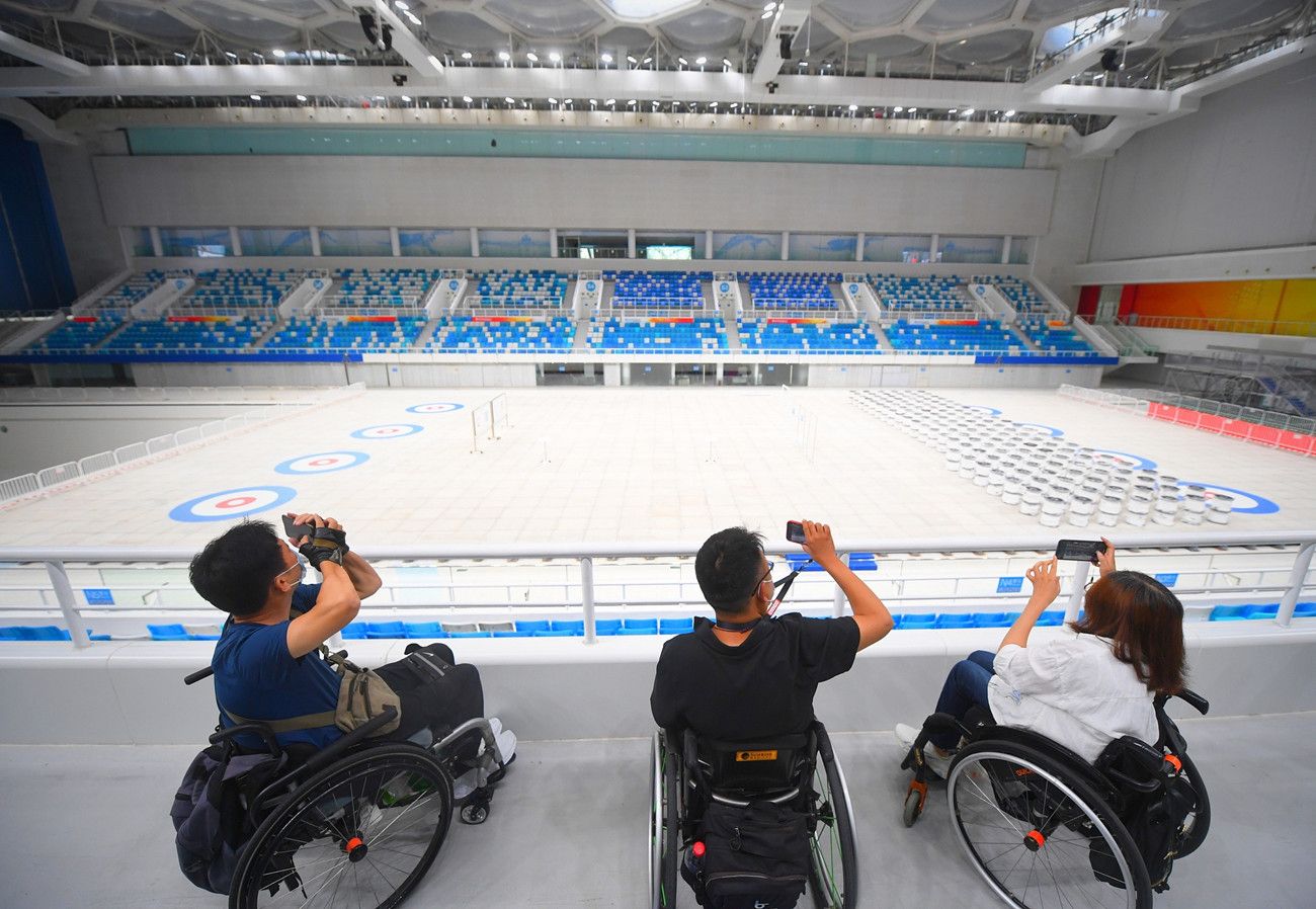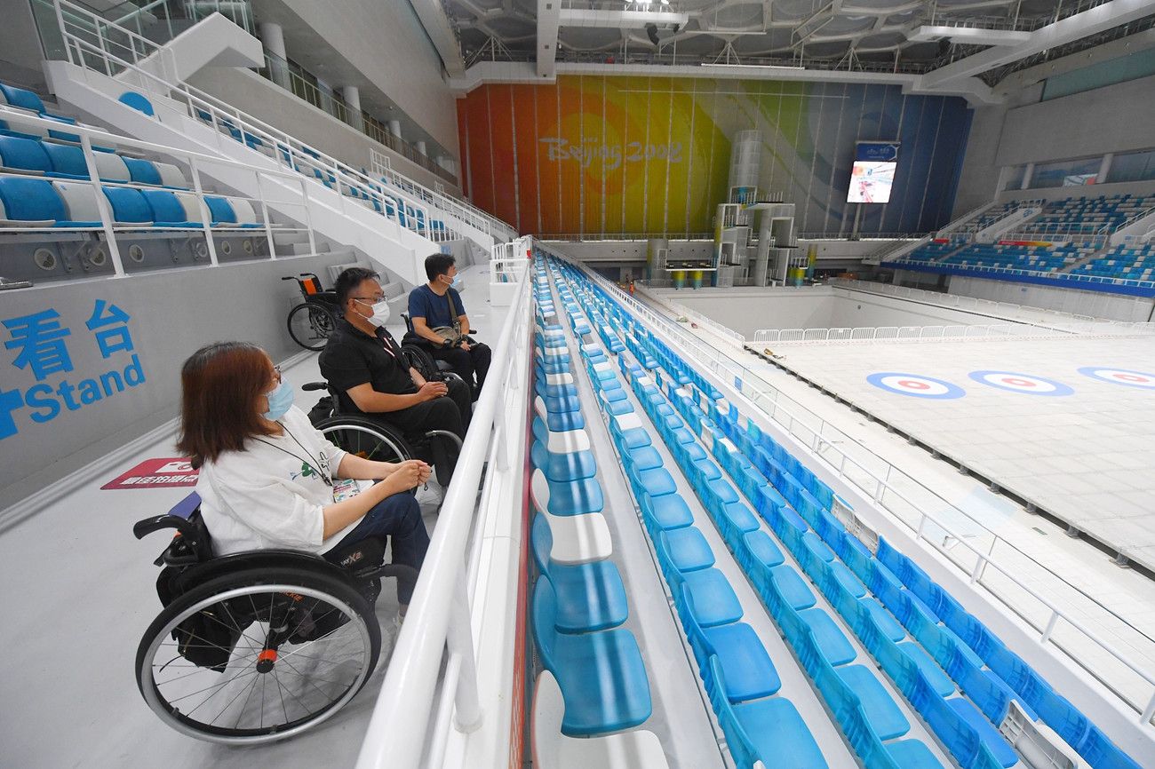 2021年8月18日,北京,三名无障碍监督员用轮椅代步,走进国家游泳中心、 北京冬奥村(冬残奥村)、北京北辰洲际酒店和奥运场馆周边的朝阳区无障碍精品示范一条街,用专业的无障碍标准和亲身体验为冬奥场馆及其周边的无障碍设施建设情况进行了一次“体检”。