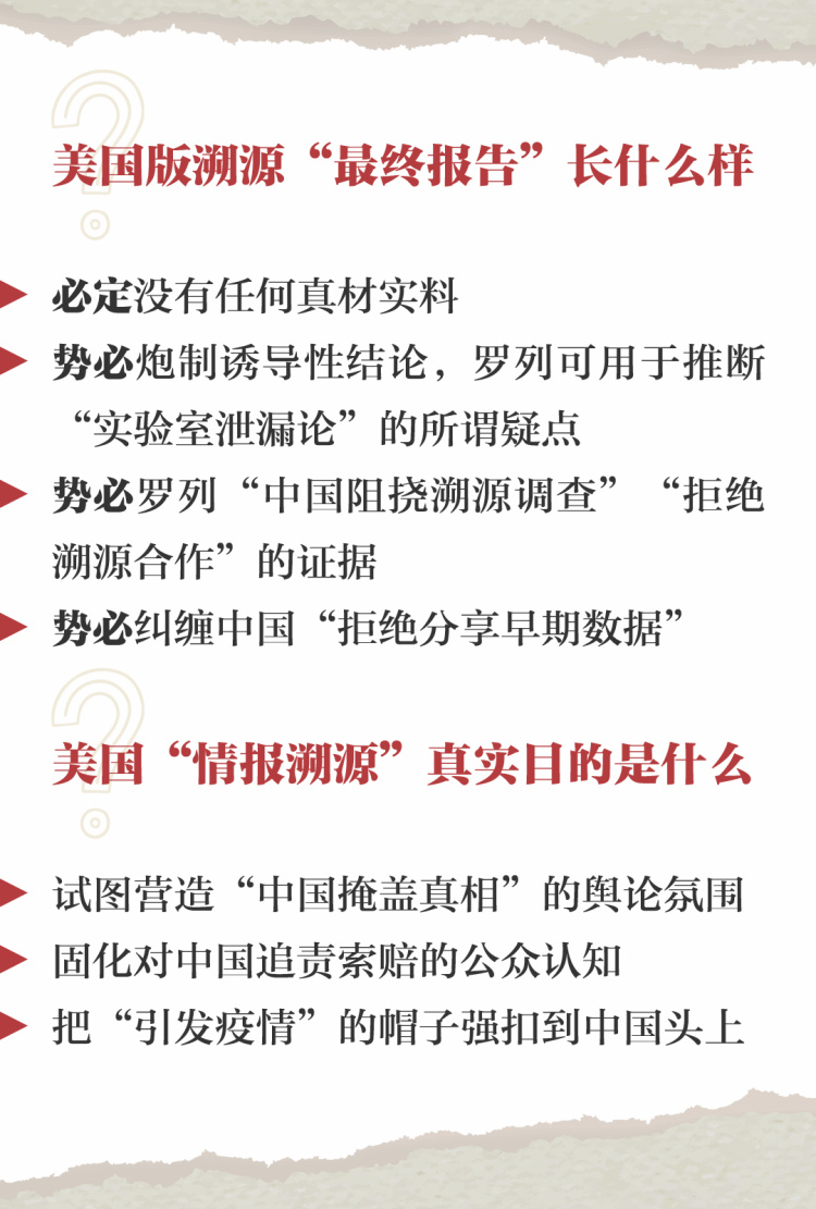 无论美国人如何事先放风铺垫,美方“情报溯源”一定都搞不到什么真材实料,最终又势必在报告中炮制诱导性结论,罗列可用于推断“实验室泄漏论”的所谓疑点和“中国阻挠溯源调查”“拒绝溯源合作”的证据,纠缠中国“拒绝分享早期原始数据”等问题,试图营造“中国掩盖真相”的舆论氛围,固化对中国追责索赔的公众认知,把“引发疫情”的帽子强扣到中国头上。