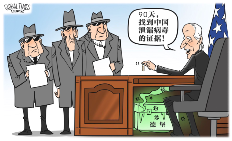▲ 拜登政府强推对华“90天情报溯源”,却对可疑的德特里克堡生物实验室遮遮掩掩。(漫画 | 刘蕊)
