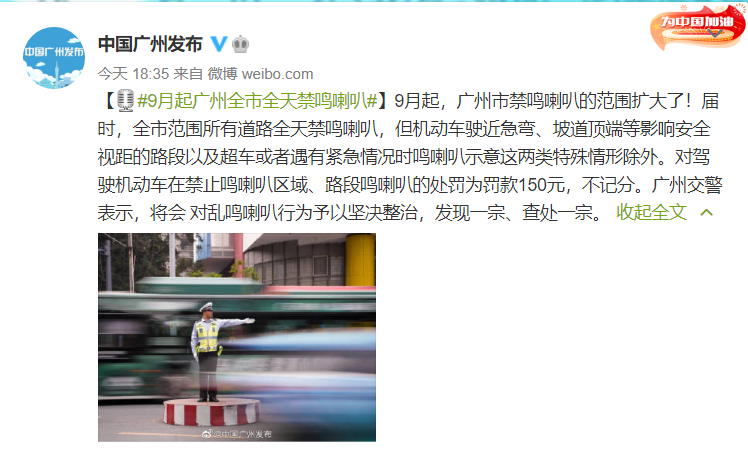 9月起,广州市禁鸣喇叭的范围扩大了!届时,全市范围所有道路全天禁鸣喇叭,但机动车驶近急弯、坡道顶端等影响安全视距的路段以及超车或者遇有紧急情况时鸣喇叭示意这两类特殊情形除外。对驾驶机动车在禁止鸣喇叭区域、路段鸣喇叭的处罚为罚款150元,不记分。广州交警表示,将会对乱鸣喇叭行为予以坚决整治,发现一宗、查处一宗。