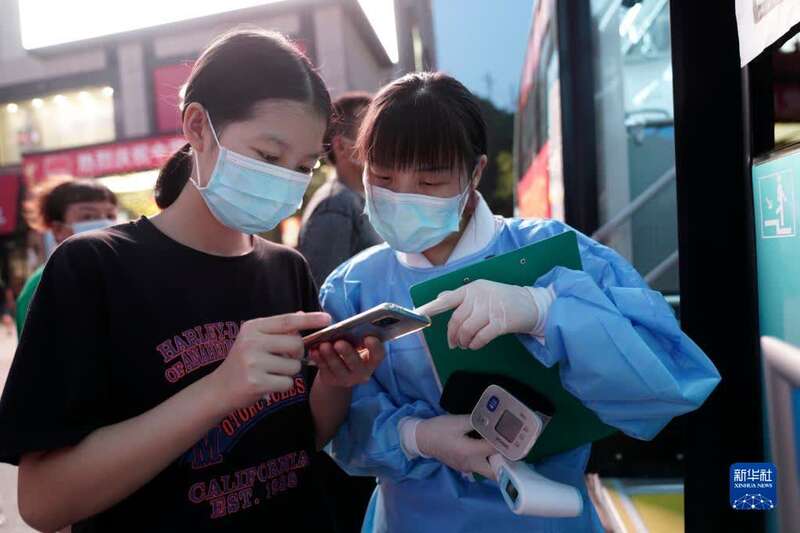 8月20日晚,在重庆市嘉陵风情步行街流动疫苗接种服务车前,医务人员为准备接种疫苗的市民测量体温。