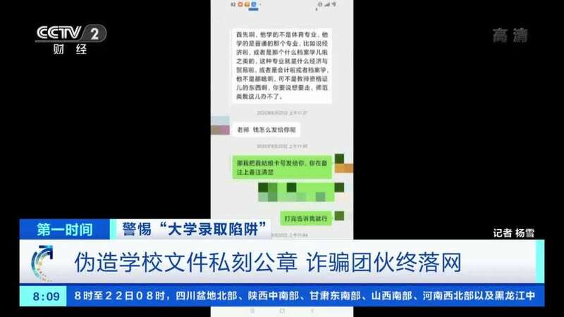 辽宁省辽河公安局刑侦支队副支队长 王家丰:正好赶上20年是发生新冠疫情的一年,他们会从网上找一些通知,各大学校都有一些相关通知,延迟上学,这正好符合客观实际。他们会自己做一些文件,PS上公章,公章都是半截的,不会PS完整的,然后打印出来,通过微信给被害人发过去。