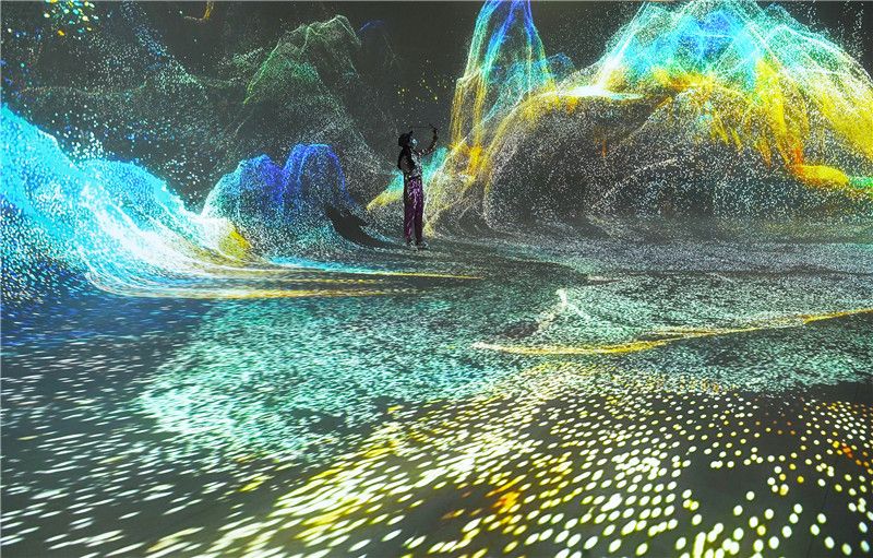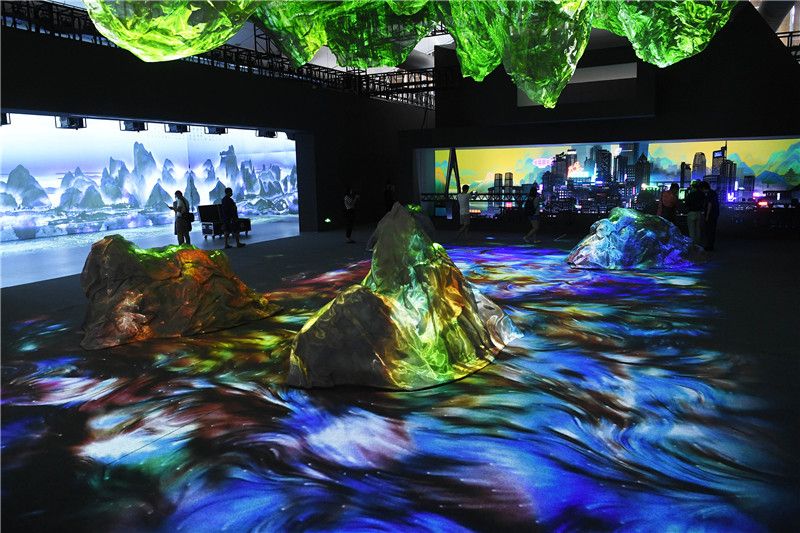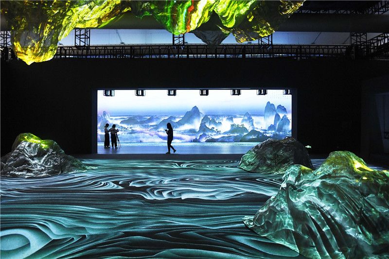 2021年8月22日,《画游千里江山——故宫沉浸艺术展》在重庆礼嘉智慧公园启幕。展览由“文化长廊”“画境万千”等8大展区组成,包含感官体验、沉浸交互、艺术装置、空间造景等16个创意展项。 中新社记者 陈超 摄