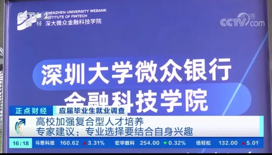 近日,CCTV-2央视财经频道《正点财经》栏目关于“复合型人才培养“该热点进行报道。为了更好地满足未来市场对人才市场的需求,加大对新职业人才的培养,许多高校尝试与企业合作,结合专业设置和就业市场进行人才培养,共同打造融合多学科的创新型人才, 此举深受用人单位欢迎。其中,深圳大学面向金融科技类人才的创新实验班再次获得高度肯定!