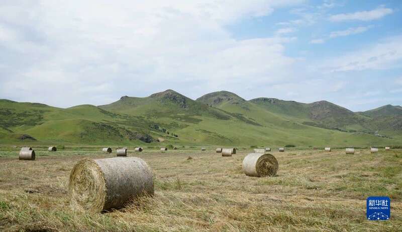 乌兰毛都草原上打好捆的草卷(8月22日摄)。新华社记者 侯维轶 摄