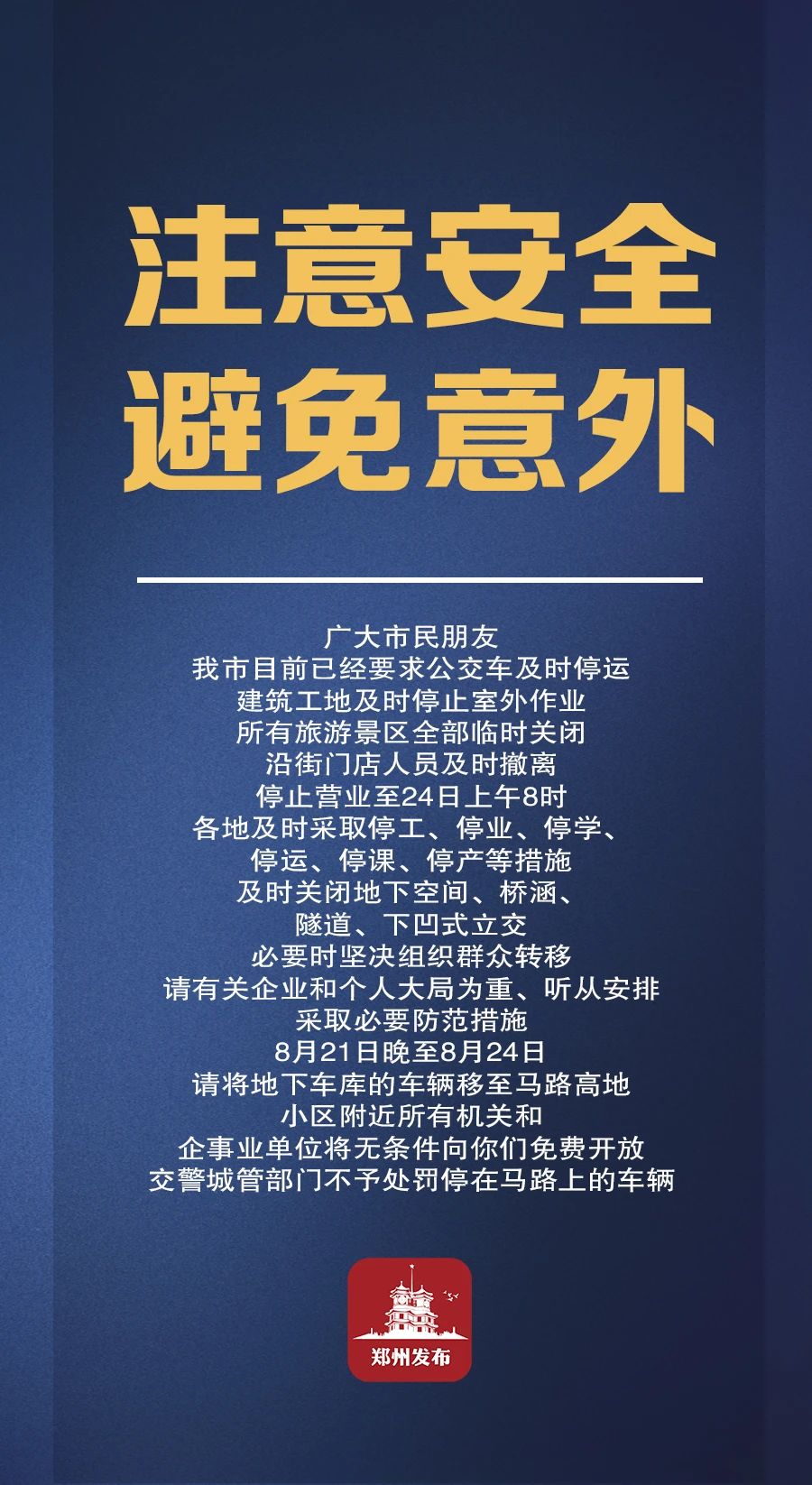 据郑州市防汛抗旱指挥部消息:目前郑州市防汛抗旱指挥部已启动防汛Ⅱ级应急响应。要求公交车停运,建筑工地停止室外作业,所有旅游景区全部临时关闭,沿街门店停止营业至24日上午8时。各级各类学校(含幼儿园)、培训机构,停止一切线下教学、暑期培训和夏令营等活动。
