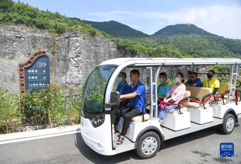 8月20日,重庆铜锣山矿山公园观光车司机余良明(左二)驾车带着游客游览,他是石船镇石壁村村民。新华社记者 王全超 摄