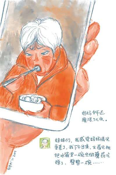她突然变得食量大增,控制不住地找东西吃。她偷吃零食,趁家中无人拿出冰箱里的一碗生的蘑菇吃掉了,甚至还吃过生馄饨、生南瓜、剩菜……“我陆续看了一些资料,大约了解到这个病症还会让人突然变得情感淡漠、无精打采、情绪沮丧、忧郁、自私、沉默、做事缺乏主动及失去动机,还有对任何事情都没有兴趣、说话含混不清、饮食习惯改变、丧失羞耻感、不讲个人卫生、判断力和警觉性日渐衰退……妈妈无一例外都中招了。”亦邻介绍道。