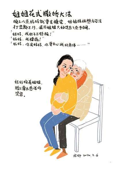 比如亦邻画了一幅《姐姐花式撒娇大法》,上面写着:晚上八点妈妈就要去睡觉,姐姐妹妹想方设法打岔都不行,最后姐姐只好使出了杀手锏。“妈妈,我肚子不舒服!”“妈妈我腰痛!”“妈妈,你是妈妈,你要关心我的身体……”妈妈抱着姐姐,脸上露出慈祥的笑容。