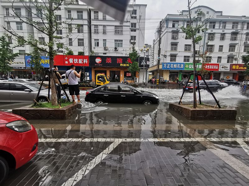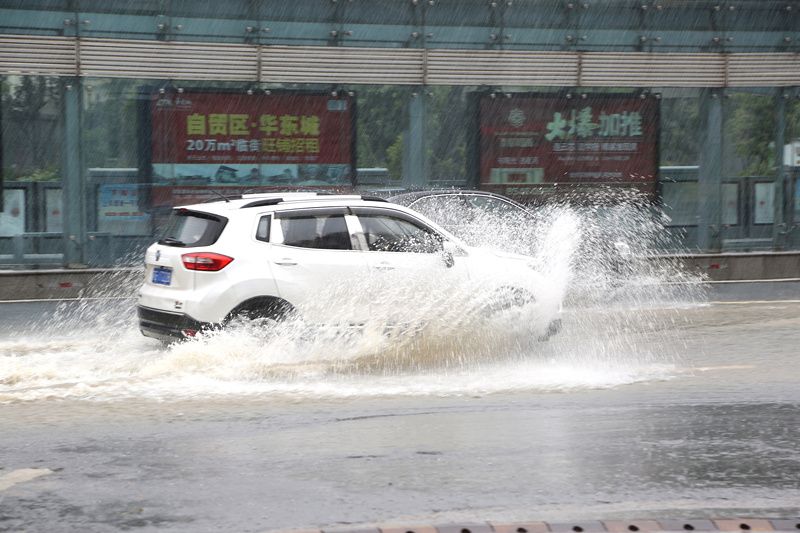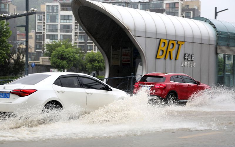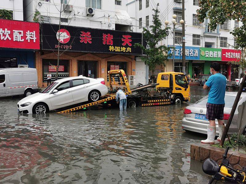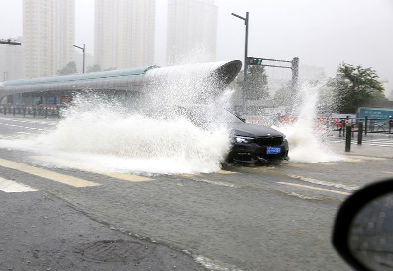 2021年8月23日,江苏连云港,车辆在连云区中山路积水中艰难行驶。