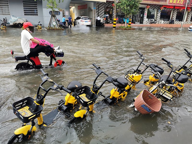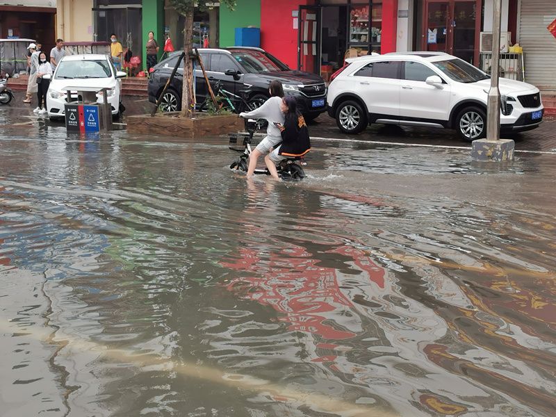 2021年8月23日,江苏连云港,赣榆区公园路上的积水,致使行人与机动车行路难。