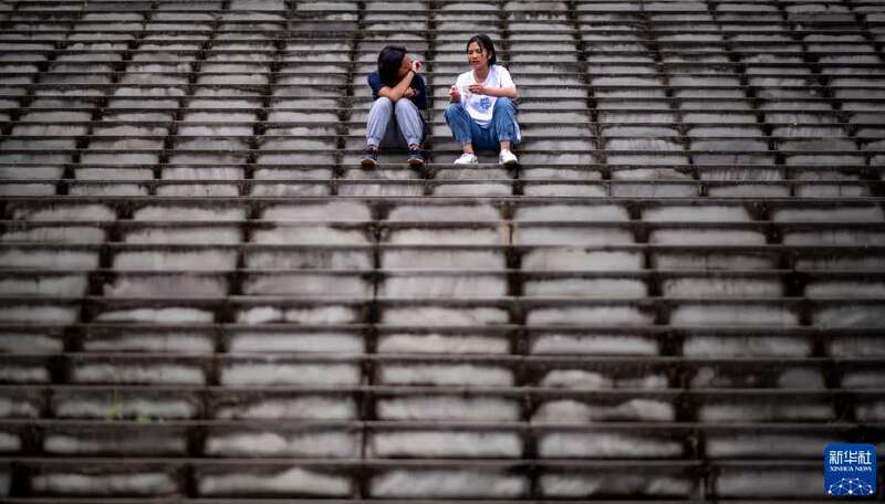 杨丽梅(右)与同学一起在校园里聊天(8月23日摄)。新华社记者 江文耀 摄