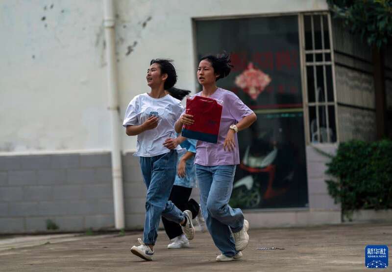 杨丽梅(左)与同学跑步回宿舍(8月23日摄)。新华社记者 江文耀 摄