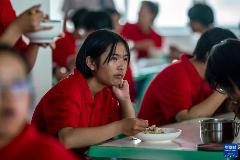 8月24日,杨丽梅在食堂吃午饭。新华社记者 江文耀 摄