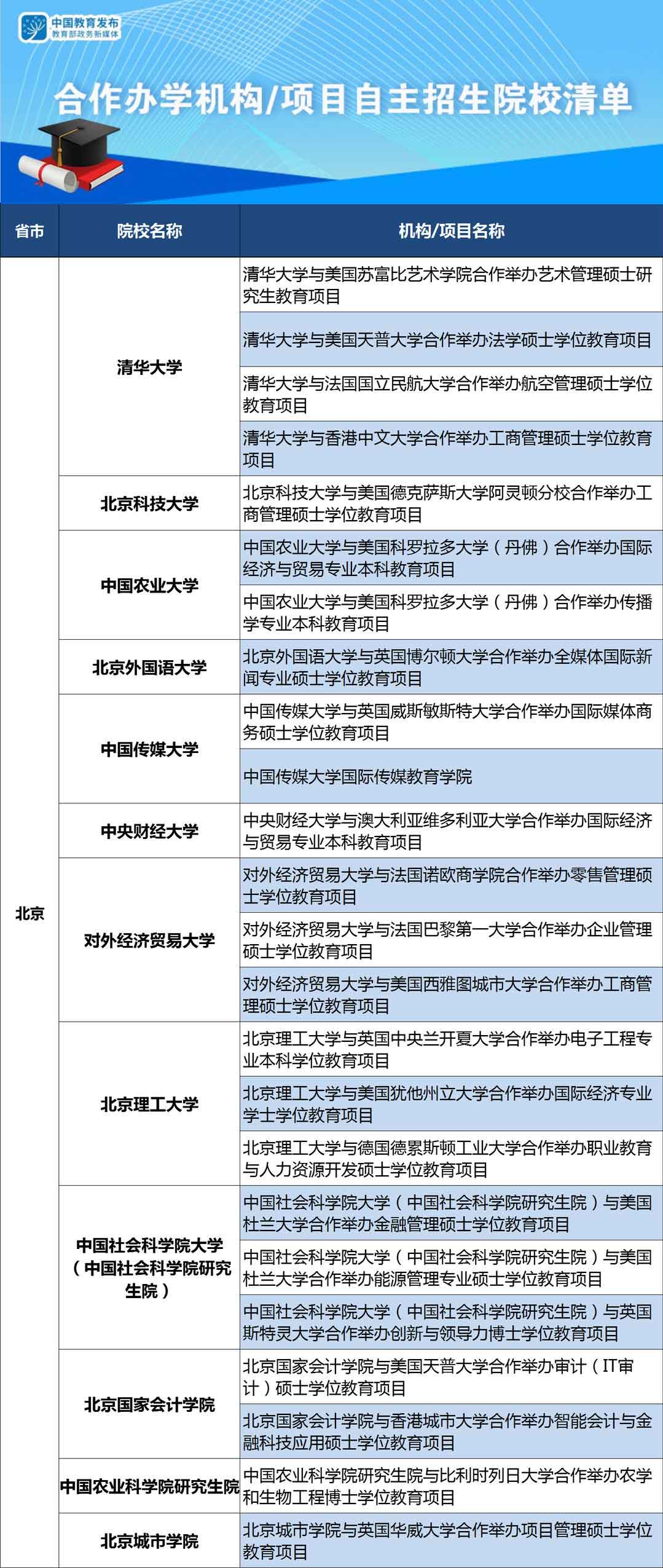 据悉,相关合作办学机构和项目在保证教育公平的前提下,发挥合作办学特色,以双向选择、择优录取方式,为学生提供国内求学机会。此次自主招生不纳入国家统一招生计划,不占用高校原有招生指标,对高校其它各类招生不产生影响。参与此次招生的合作办学机构和项目名单附后。据了解,目前相关省级教育行政部门及高校已陆续启动招生工作。