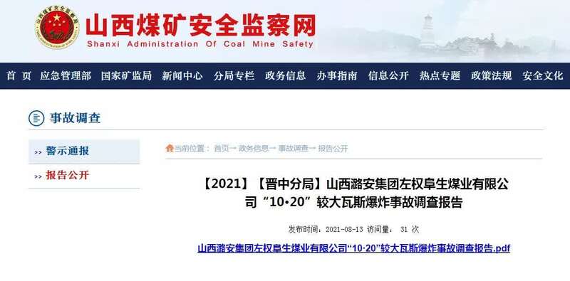 日前,总台记者从山西煤矿安全监察局官网了解到,山西煤矿安全监察局公布了山西潞安集团左权阜生煤业有限公司“10·20”较大瓦斯爆炸事故调查报告。经调查认定,该起事故是一起生产安全责任事故,且事故发生后迟报,23名责任人被给予党纪政务处分及行政处罚。