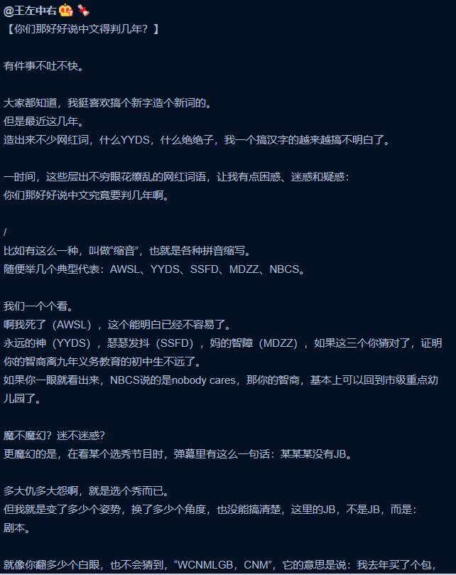 而当我们有了这些历史的知识,再回头看看当今的网络黑话,也就大可不必如临大敌了。yyds这样的词汇面临的问题在汉字拼音化时已经被前人讨论过了,这些文字只能作为网络交流的书面文字,而没有创造新的读法和含义(可能读成英文算一种创新),只能作为互联网上书面交流的符号,除了一些力图跟上潮流的综艺节目,很少能在口语中看到。既然连拼音化都算不上,就只能作为某种密码使用,也就是粉丝文化视角分析的那样。
