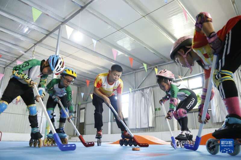 8月25日,在邢台市新河县一家乡村冰雪运动馆,教练在教授学生打冰球。新华社发(张驰 摄)