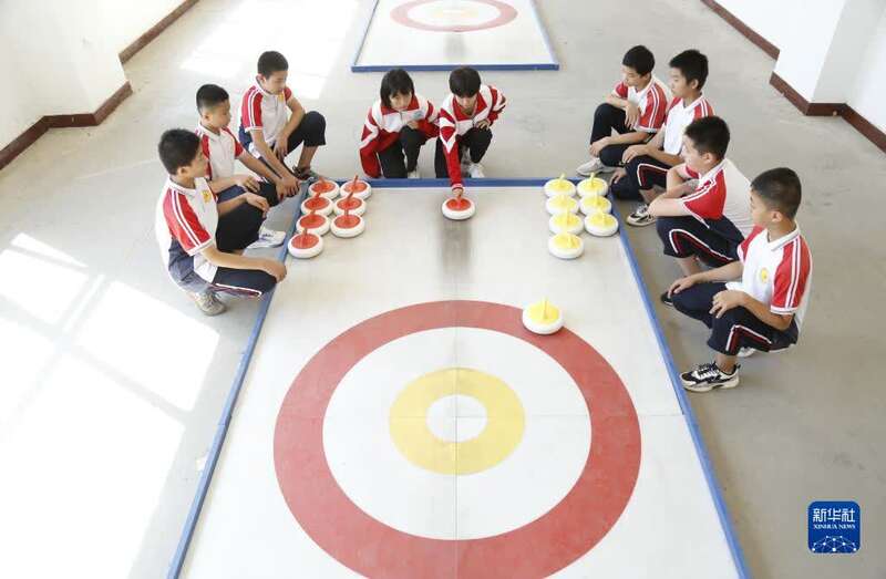 8月25日,在邢台市新河县体育场,学生在练习旱地冰壶。新华社发(张驰 摄)